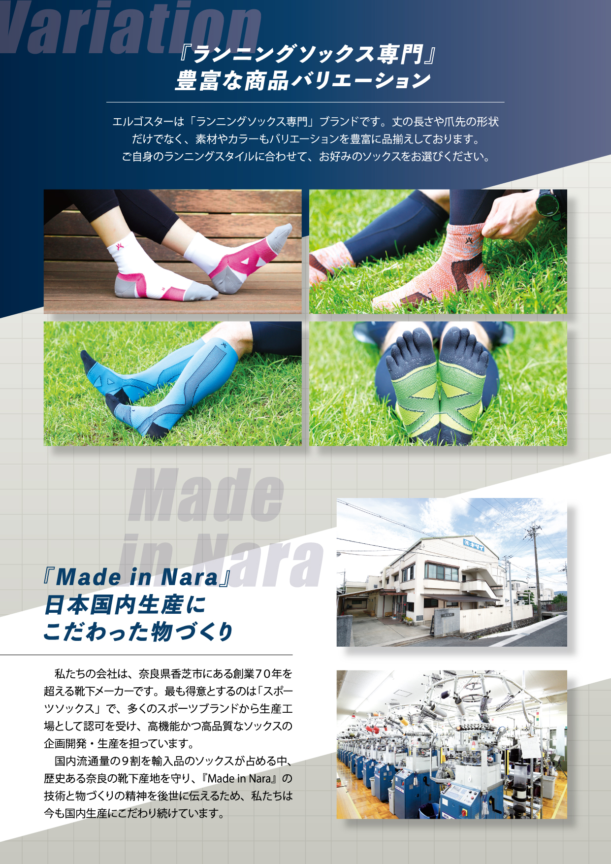 ランニングソックスの機能性や国産であることをPRしています。