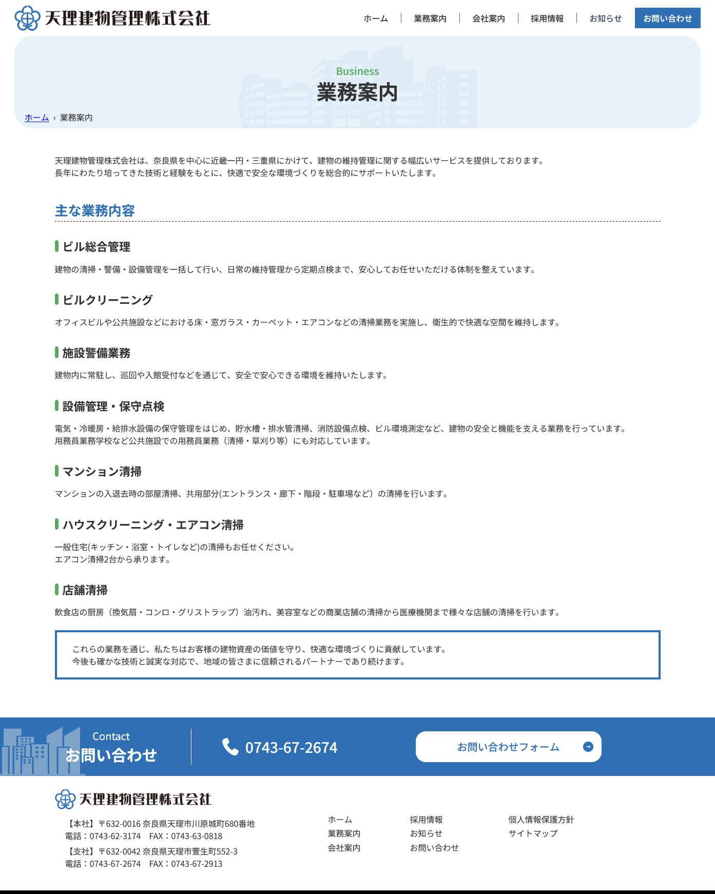 建物の管理・清掃などビル総合管理事業を行う、天理建物管理株式会社様のコーポレートサイトです。